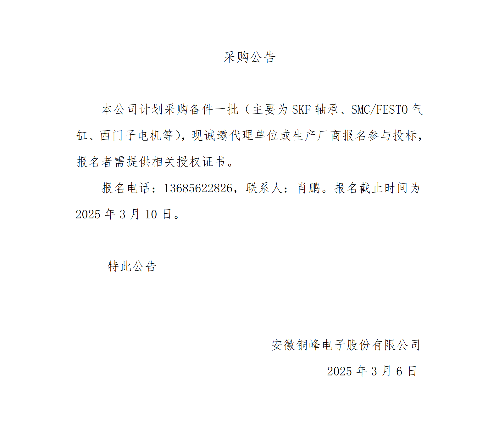 安徽銅峰電子股份有限公司新一線項目安裝招標公告