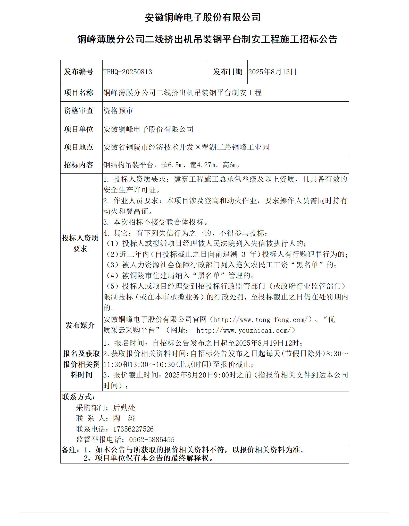 安徽銅峰電子股份有限公司 (銅峰薄膜分公司二線擠出機吊裝鋼平臺制安工程招標(biāo)公告)_01
