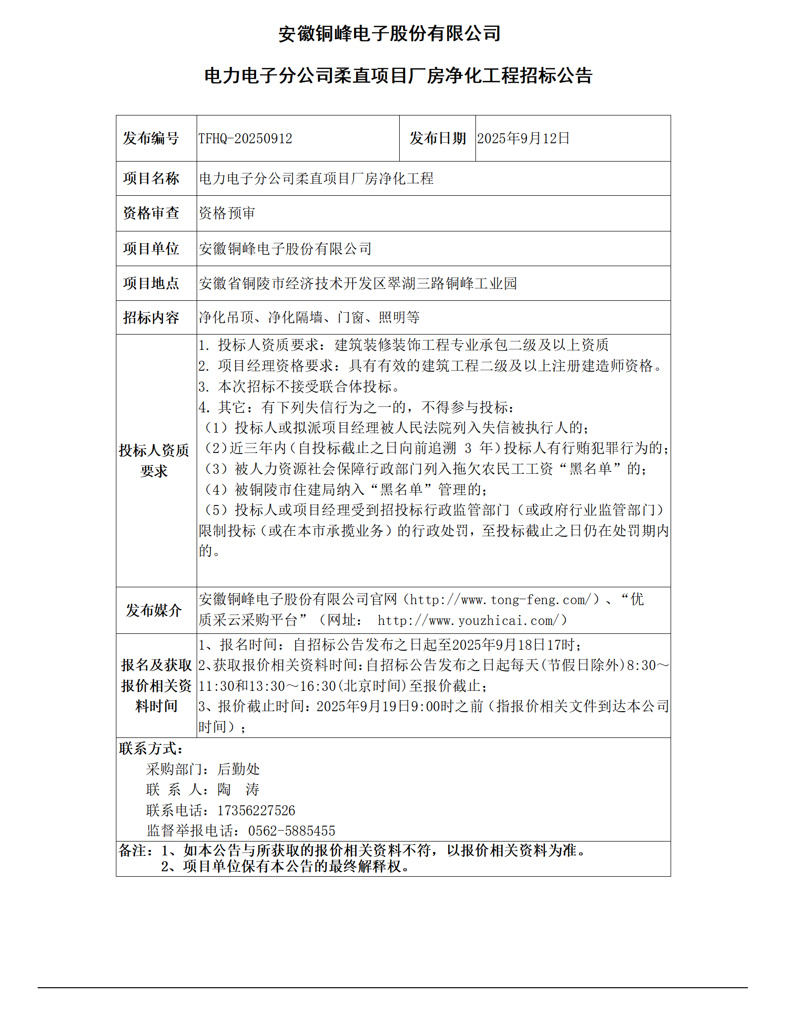 01安徽銅峰電子股份有限公司 (電力電子分公司柔直項目廠房凈化工程 招標(biāo)公告)_01